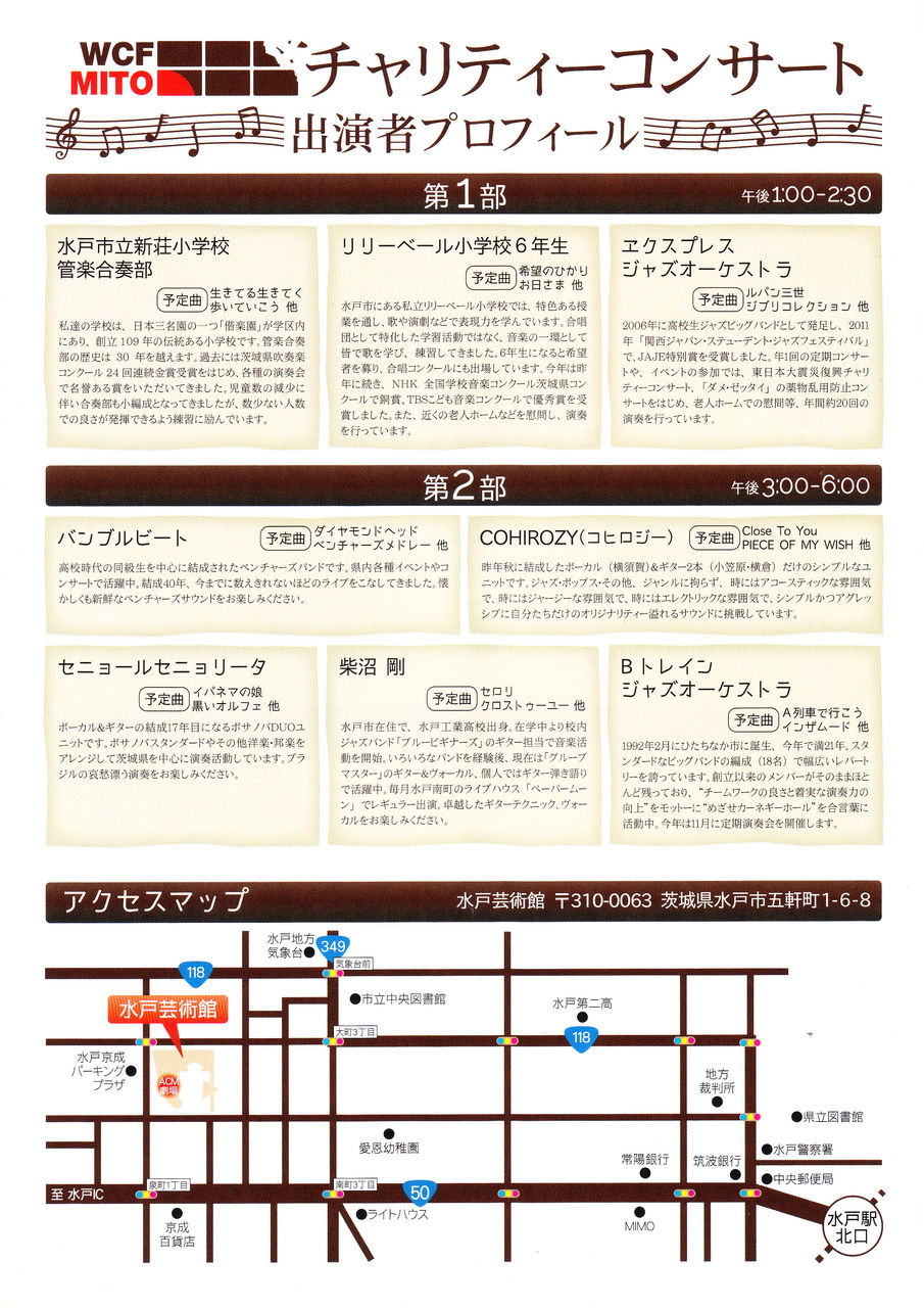 | [ フィリピン台風被災者支援のチャリティーコンサート ] フィリピンでは台風30号により、壊滅的な被害が連日報道されています。エリザベスアートスクールでは、被災者の方々を支援するため、チャリティーライブを行います。 経費を除いた収益をすべて寄付します。 当日は、アルコールや軽食を楽しみながら、音楽の夜を満喫していただけます。 [出演] マック・ギルバート[Vocal] , 愛田美樹[Vocal] 山田よしお[Guitar] 19:00〜(受付18:30〜) , 会費 4,000円(ソフトドリンク・アルコール・軽食含む)※当日入口にてお支払いください。 ご参加いただける方は、エリザベスアートスクールまでお電話ください。 ![]() 会場 [ ELIZABETH ART SCHOOL (エリザベス・アート・スクール) ] 茨城県つくば市二ノ宮2-14-16 CENTRAL88 ROOM301, Phone 080-4201-3009(エリザベス)又は090-7807-2725(林) |